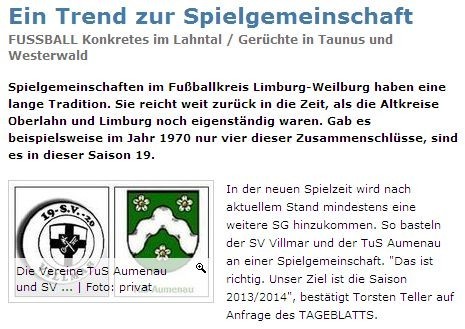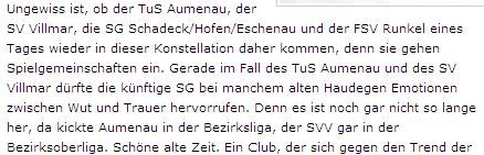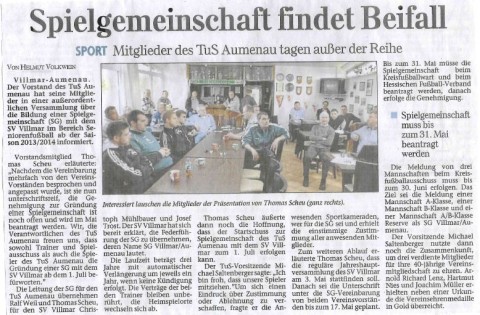 Zu diesem Kommentar kann man sicher nur folgendes sagen, ich konnte bisher in den letzten Wochen keine Wut und Trauer im TuS Aumenau feststellen, die Kommentare auf der JHV am 21.Januar 2013 waren durchweg positiv, durchaus kritisch hinterfragend und vor allem eine Aufforderung eine SG zu gründen. Genau so war es auch in der außerordentlichen JHV am 7.April 2013, zudem gab es an diesem Tag ein einstimmiges Votum zur Gründung einer SG mit dem SV Villmar.