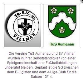 Am 13.Mai 2013 wurde in einer gemeinsamen Sitzung mit den Verantwortlichen des SV Villmar im Vereinsheim des SV Villmar eine Vereinbarung zur Gründung einer SG Villmar/Aumenau im Seniorenbereich Fußball der 1. & 2.Mannschaften unterschrieben.